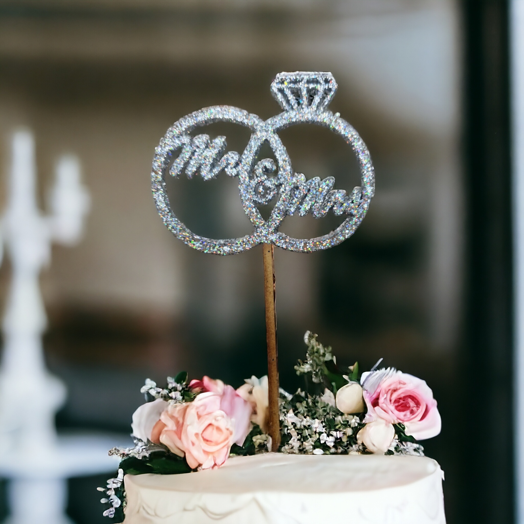 Topper lemn cu sclipici Mr & Mrs argintiu