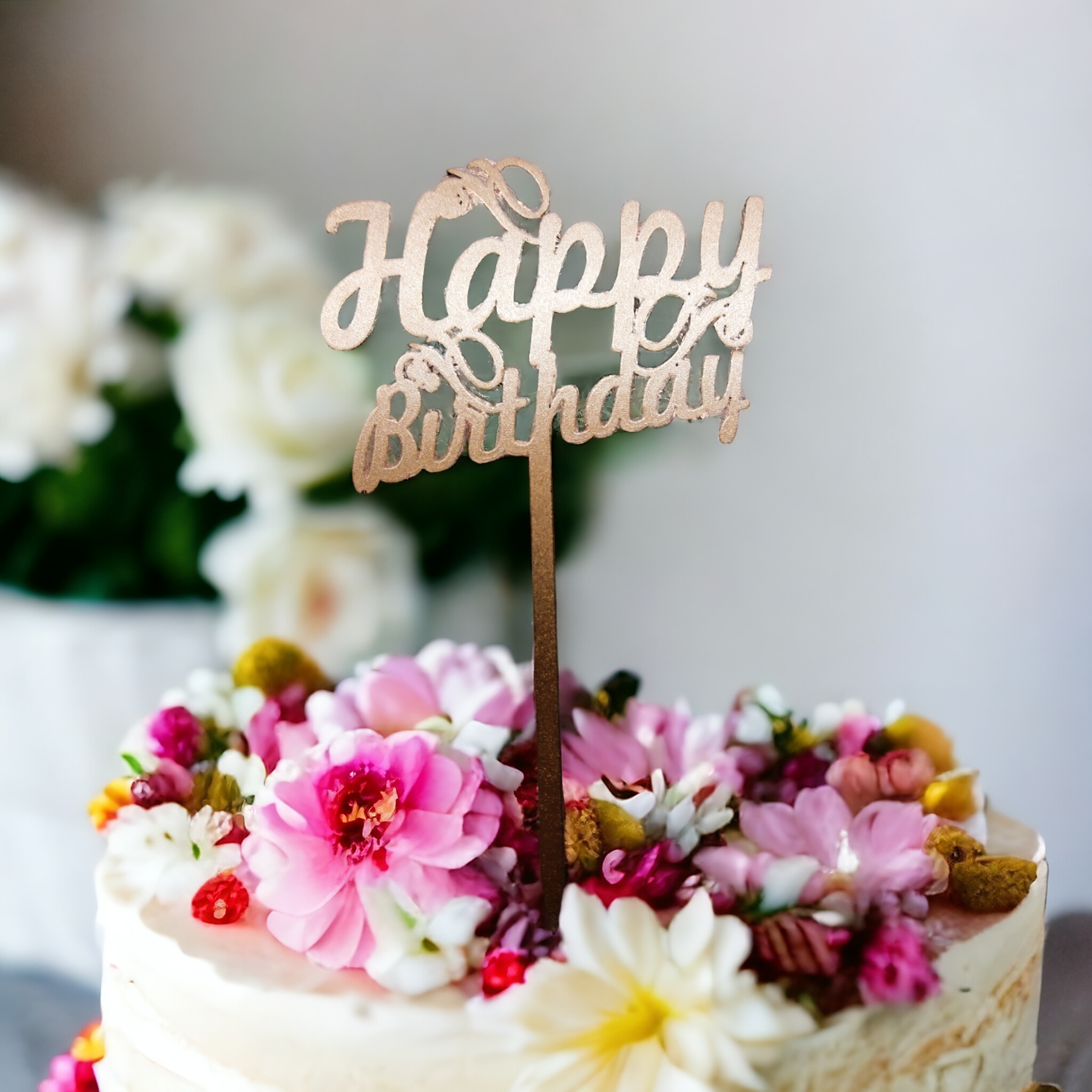 Topper lemn in folie Happy Birthday roz auriu