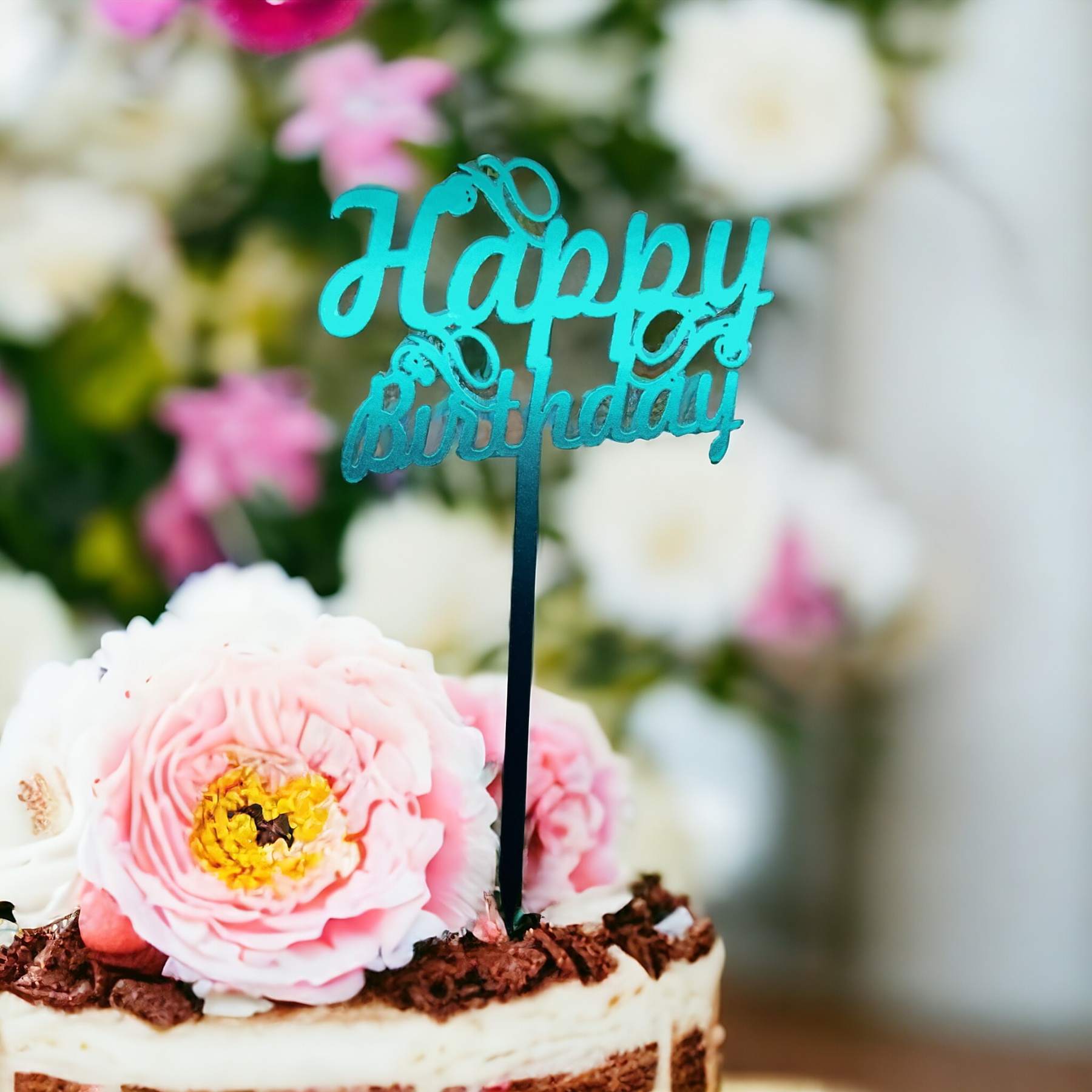 Topper lemn in folie Happy Birthday turcoaz
